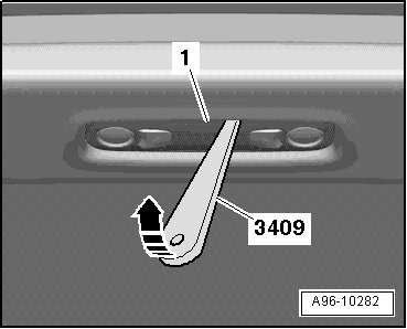 - Carefully pry off interior/reading light - 1 - out of roof cutout - arrow - using (3409).