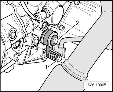 - Remove nut - 2 - which is accessible from top for front exhaust pipe/exhaust manifold.