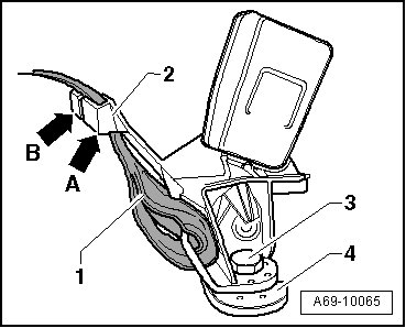 - Thread belt webbing - 1 - out of guide clip - 2 - on rear center floor assembly anchorage point (belt buckle with right retainer).