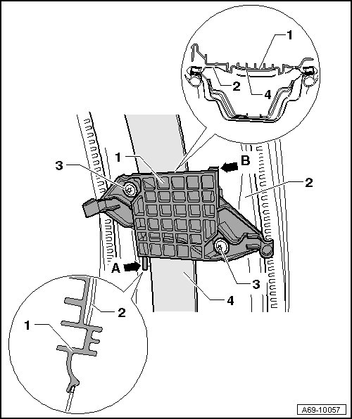 The tab - arrow A - must fit in the opening - 2 -. This holds belt guide - 1 - in top position.