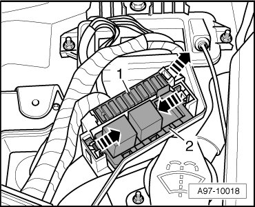 - Release locking mechanisms - arrows - and pull fuse panel - 1 - and secondary relay carrier - 2 - upward in E-Box left plenum chamber.