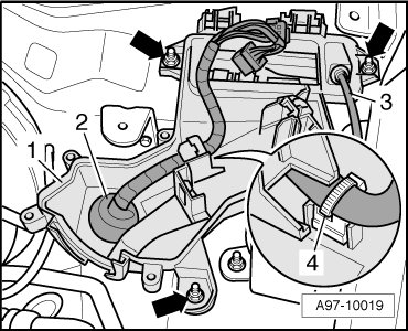 - Disengage engine wiring harness - 4 - at E-Box left plenum chamber - 1 -.