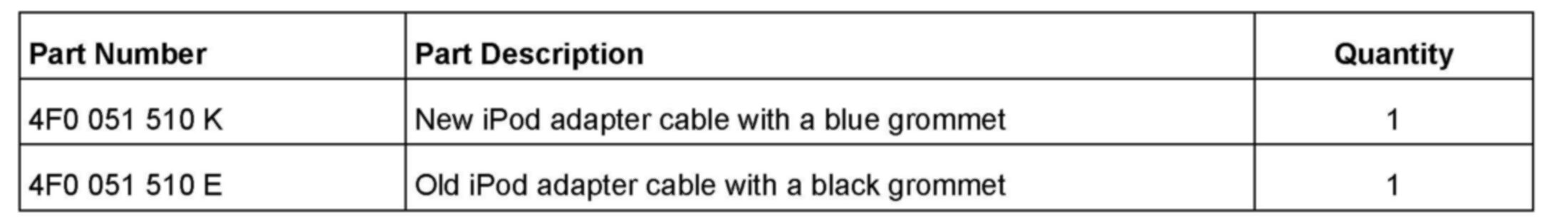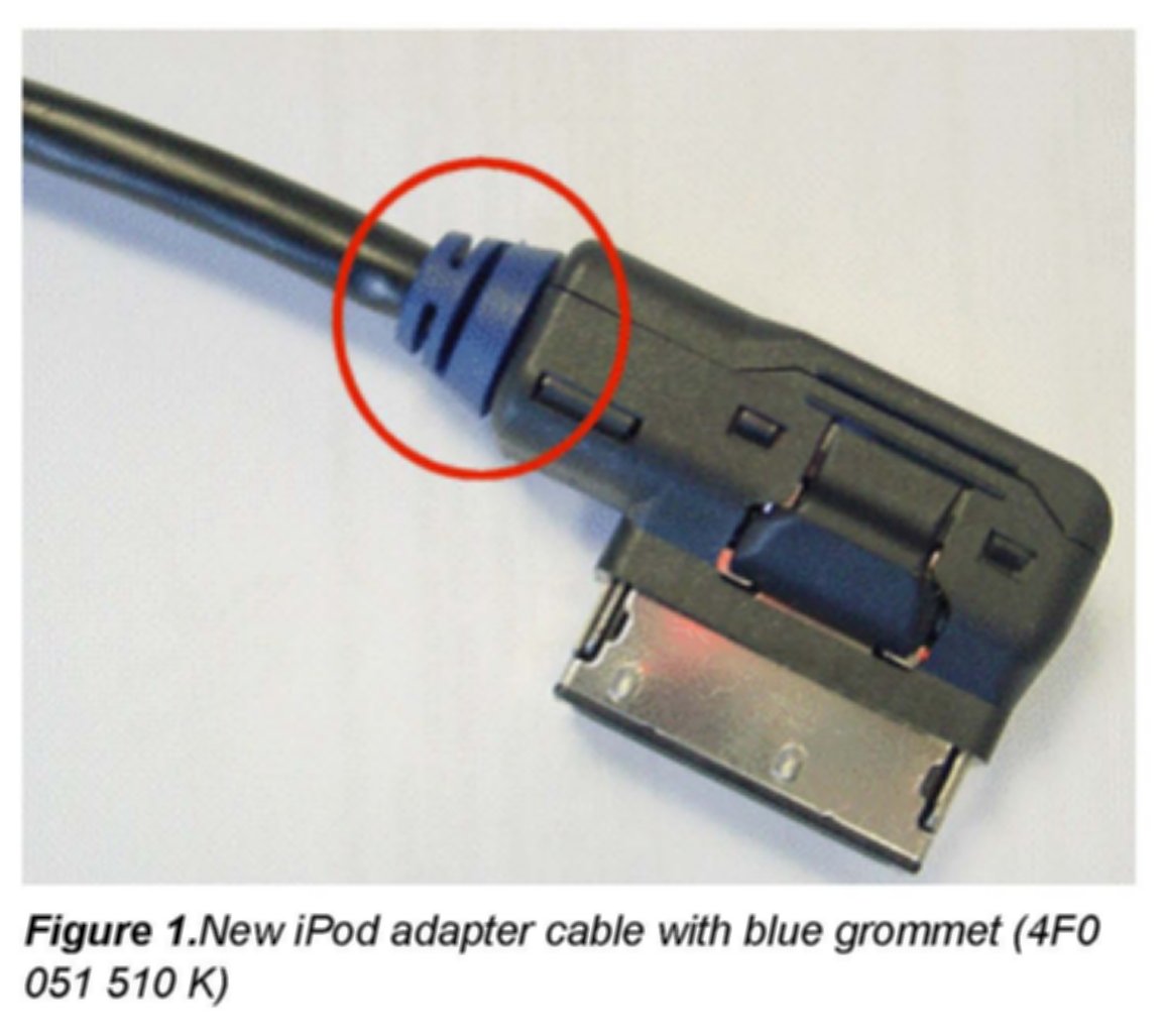 As a result of the new development in the Audi Music Interface, a new iPod adapter cable was introduced. It can be identified by a blue instead of a black grommet.