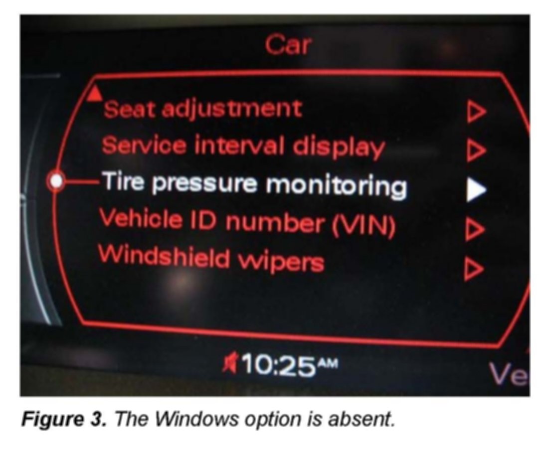 If a particular bit is set in Adaptation channel 18, Windows is displayed in the Car Settings menu. Since the option may not be available in this vehicle, it is inactive and grayed out.