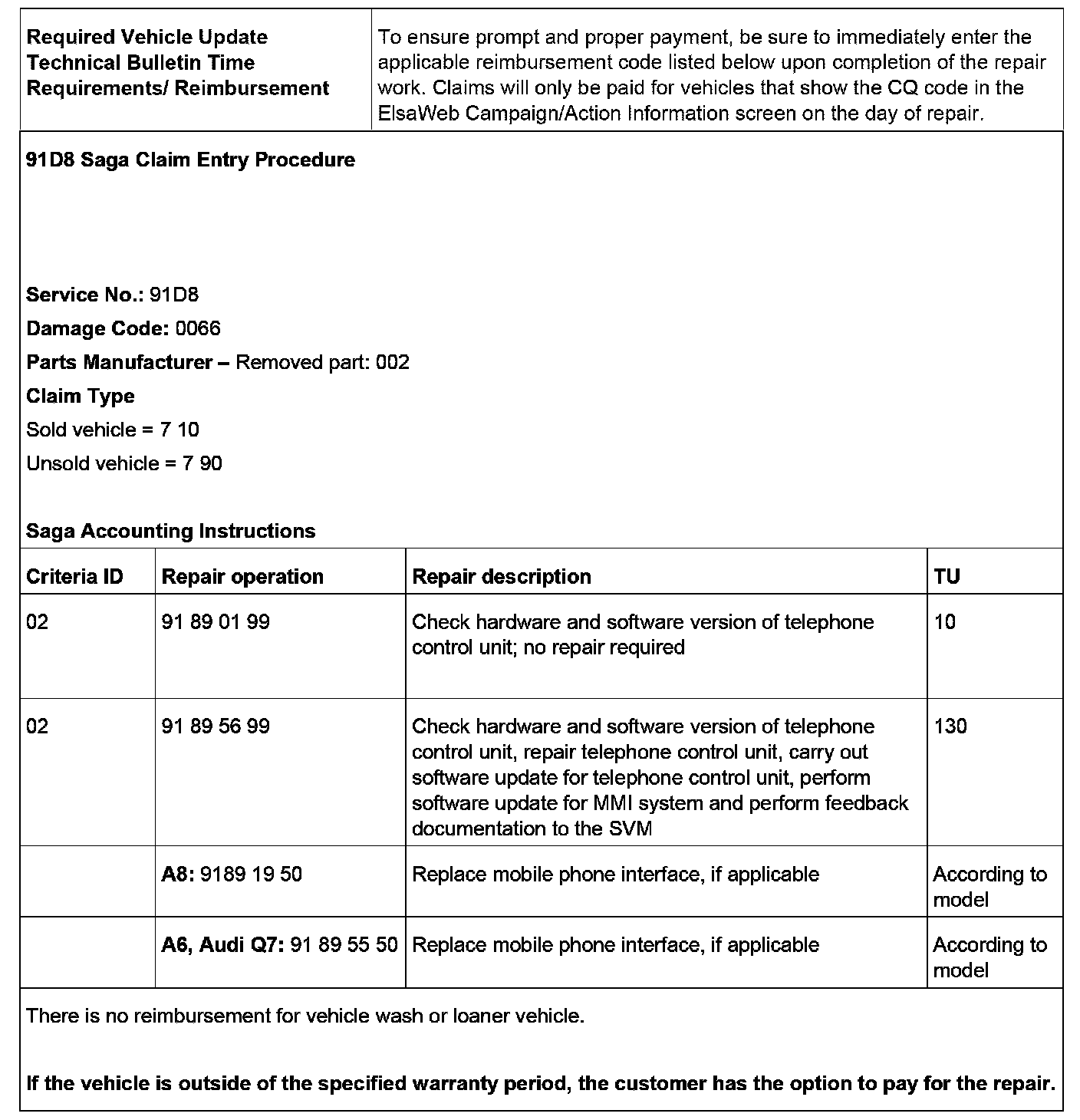 - Procedure is valid only for vehicles that show the CQ / 91D8 code in the ElsaWeb Campaign/Action Information screen on the day of repair.