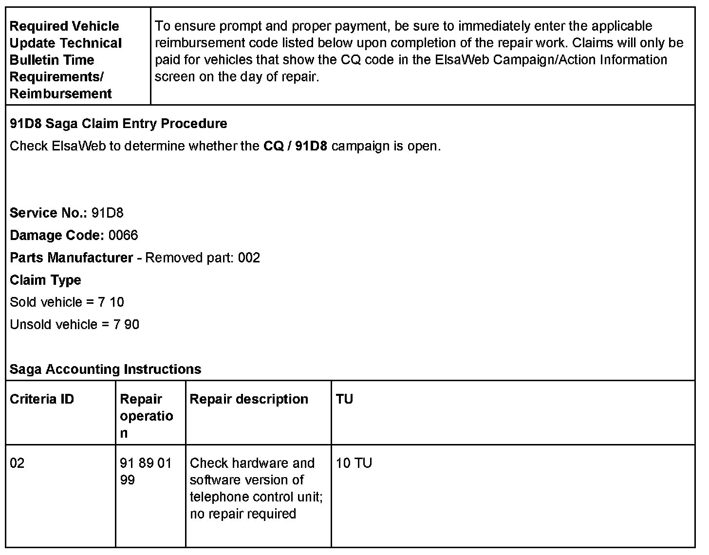 - Procedure is valid only for vehicles that show the CQ / 91D8 code in the ElsaWeb Campaign/Action Information screen on the day of repair.