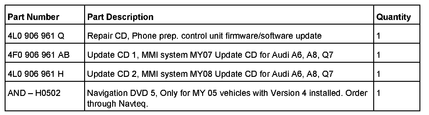 1. If the vehicle is MY 2005, it may still have a Version 4 Navigation DVD installed. Replace Version 4 Navigation DVDs with a Version 5 Navigation DVD prior to the MMI component Update.
