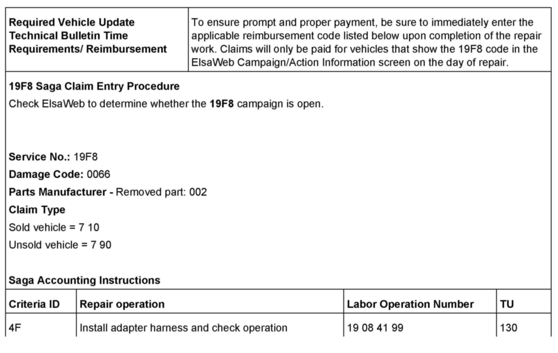 ^ Procedure is valid only for vehicles that show the 19F8 code in the ElsaWeb Campaign/Action Information screen on the day of repair.
