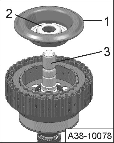 - Carefully guide thrust plate - 1 - with pistons - 2 - up over shaft - 3 -.