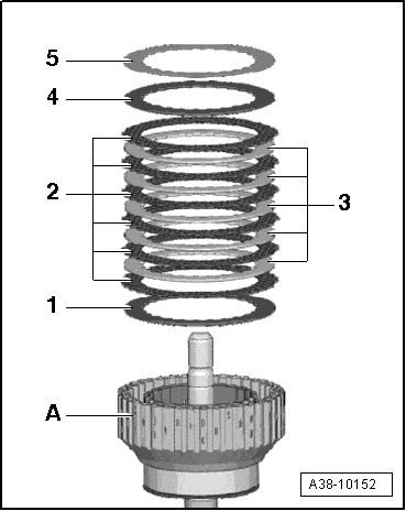 - Remove all discs lining - 2 - and outer discs - 3 - from input shaft cylinder - A -.