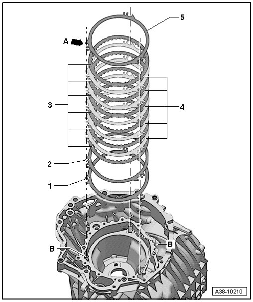 - Then, alternating with the same direction for each lining disc - C - (6 pieces) and place an outer disc - B - ( 5 pieces) on the corrugated spring washer.