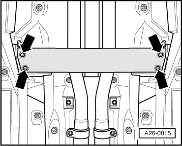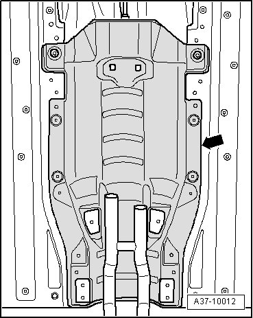 - Remove rear noise insulation by loosening fasteners - 2 - and, if equipped, - arrow -.