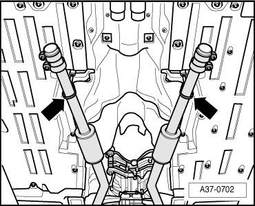 - Tie left and right exhaust system pipes up to body - arrows -.