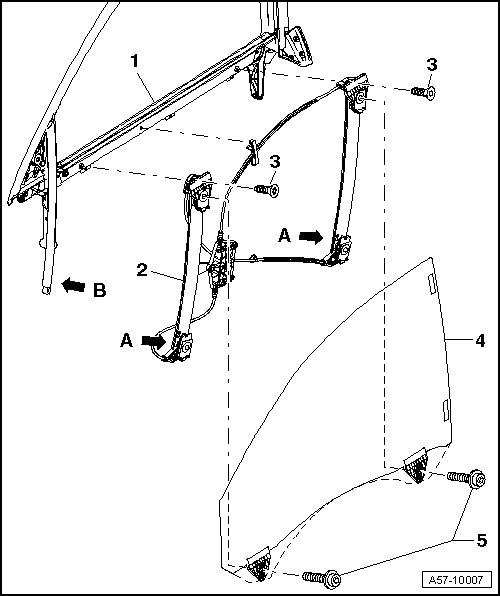 • Remove the bolts - 5 - and remove door windows from window regulator.