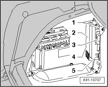- Disconnect the connectors - 3 - and - 5 - from the digital sound system control module (J525) - 2 -.