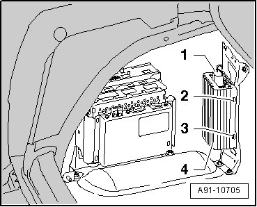 - Remove bolts - 2 - and - 3 - (3 Nm) at Digital Sound System Control Module (J525) - 4 -.