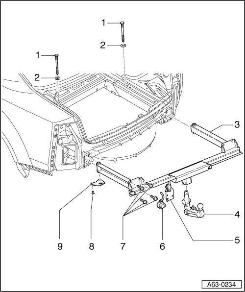 • When installing, screw in bolt through balancing element (refer to => [ Trailer Hitch Balancing Element Function ] Trailer Hitch Balancing Element Function ) into threaded bush - 7 - of mounting element - 9 -.