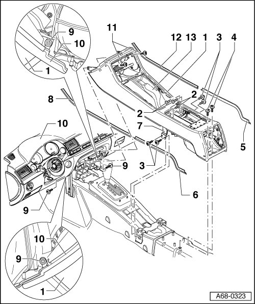 • Removing and Installing => [ Front and Rear Carpet Strips ] Center Console without Extension