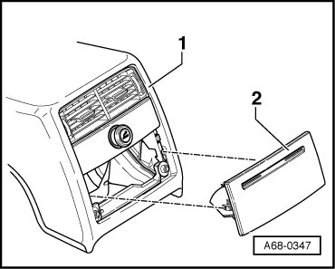 - Remove the rear storage compartment - 1 - from the center console - 2 -.