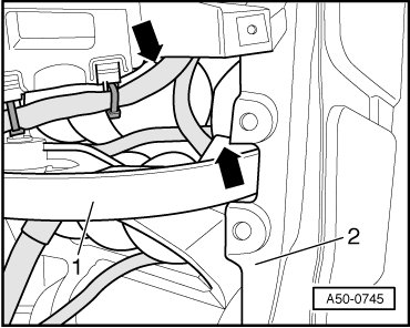 - During installation, make sure the cables or hoses - arrows - do not get caught between the lock carrier and the brace - 1 - or the fender - 2 -.