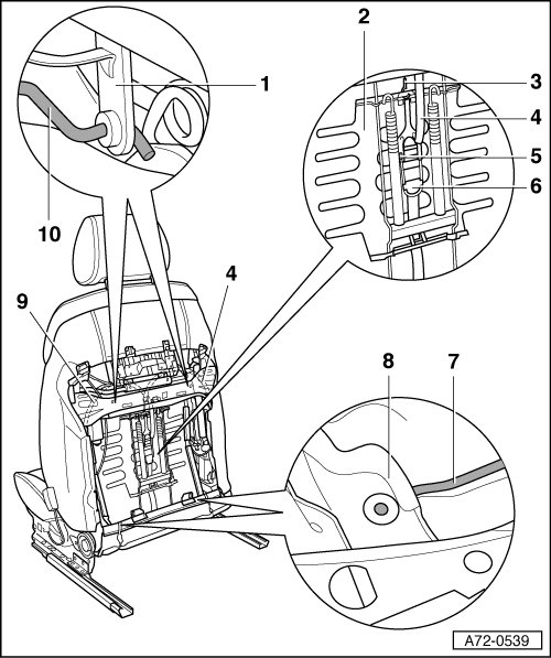 - Disengage the bracket - 7 - at bottom on left and right sides from the backrest frame - 8 -.