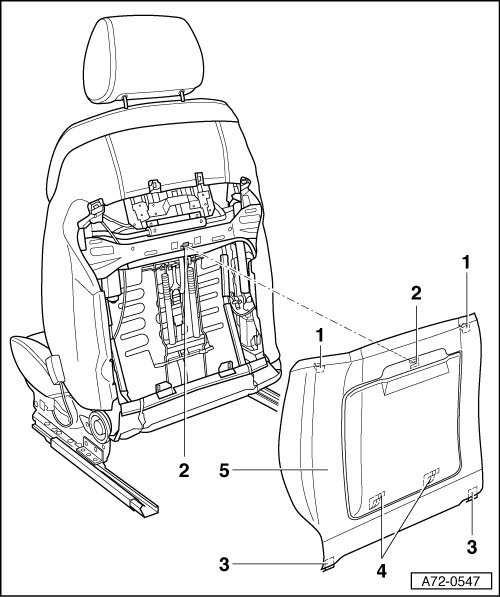 - Disengage backrest cover - 5 - upward from brackets - 3 - (Qty. 2) and - 4 - (Qty. 2).
