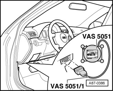- With ignition off, connect Vehicle Diagnosis, Testing and Information System (VAS 5051) with diagnostic cable (VAS 5051/1) to 16-pin vehicle Data Link Connector (DLC) and select parking brake in OBD using "Address word" 53.