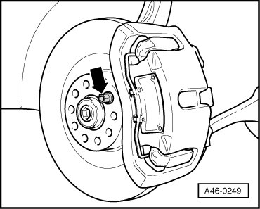 If brake pads are ceramics, wheel must not fall on brake disc, otherwise it will be irreparably damaged. To install/remove wheel, install two assembly pins from vehicle tool kit in mounts on wheel bolts. The long assembly pin is in the upper position.