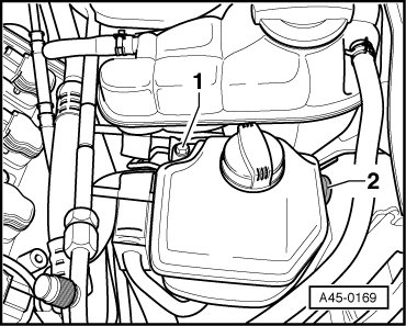 - Remove power steering fluid reservoir hex bolt - 1 - and remove sideways from rubber bushing.