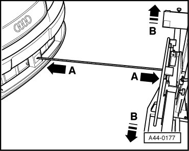 - Now align the (VAS 6190) by sliding it sideways - arrows B - so that the laser beam is centered horizontally on the approximate adjustment device.