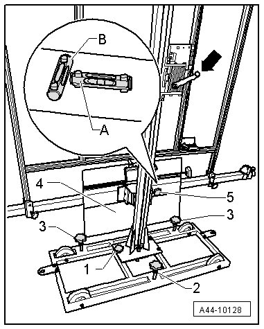 - Level the bubble levels - A and B - on the (VAS 6430) using the adjusting screws - 1, 2 and 3 -.