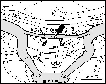 - Loosen threaded connections - arrow - of brace between exhaust pipes.