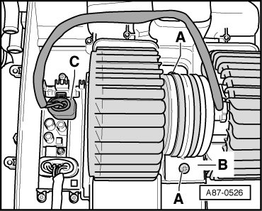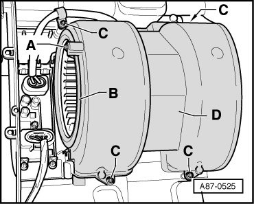 - Remove bolts - A - and remove two air guide rings - B - left and right.