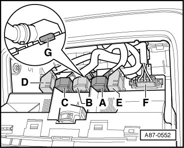 • Front A/C control head Climatronic Control Module (J255) is not connected to terminal "15", therefore after voltage supply interruption (via connector - E -), it is necessary to wait at least 30 seconds to protect electronics until remaining connections are disconnected.