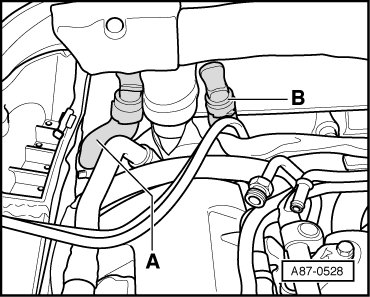 - Mark the arrangement of coolant hoses - A - supply to pump valve unit and - B - return to engine.