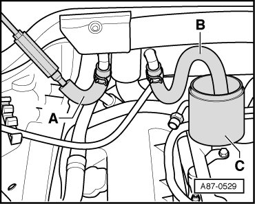 - Remove coolant hoses - A - and - B - from connections.