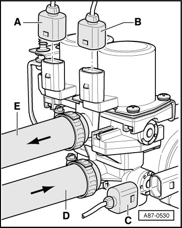 - Remove coolant hoses - D - and - E - from pump valve unit.