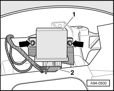 - Remove bolts - arrows - and remove bracket - 1 - for headlamp range control module (J431) from instrument panel support.