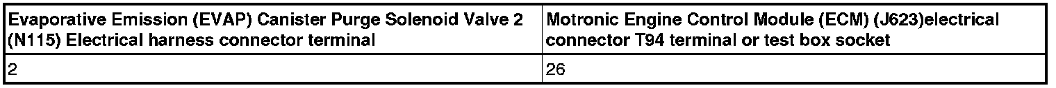 - Using a Multimeter, check the Evaporative Emission (EVAP) Canister Purge Solenoid Valve 2 (N115) electrical connector terminal 2 to the Engine Control Module (ECM) (J623) electrical connector T94 terminal 9 for an open circuit.