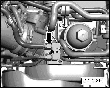 - Disconnect fuel supply line - arrow - on distribution piece.