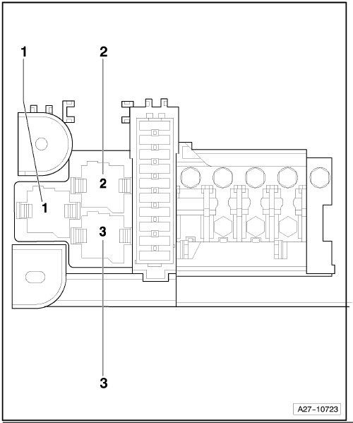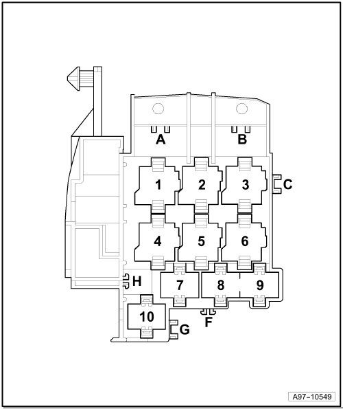 • Only left-hand drive, Position of Relays => [ Assignment relay and fuse panel, behind instrument panel, left ] Overview of Relay Carrier