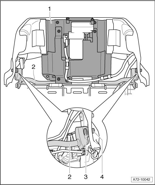 - Pull out headrest adjustment motor with active headrest unit - 1 - and shaft - 2 - downward.