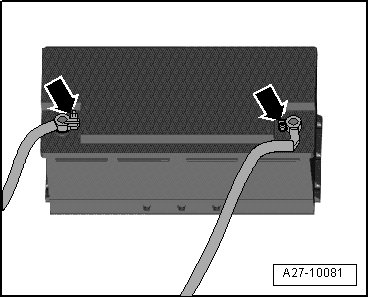 • Battery terminal clamps - arrows - must only be installed by hand without applying force.