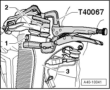 - Insert the front upper control arm - 2 - stud in the wheel bearing housing - 3 - and compress it as far as possible using the (T40067).