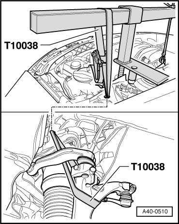 - Raise both wheel bearing housings approximately 50 mm and secure. Guide the (T10038) through the hole in the body to do this.