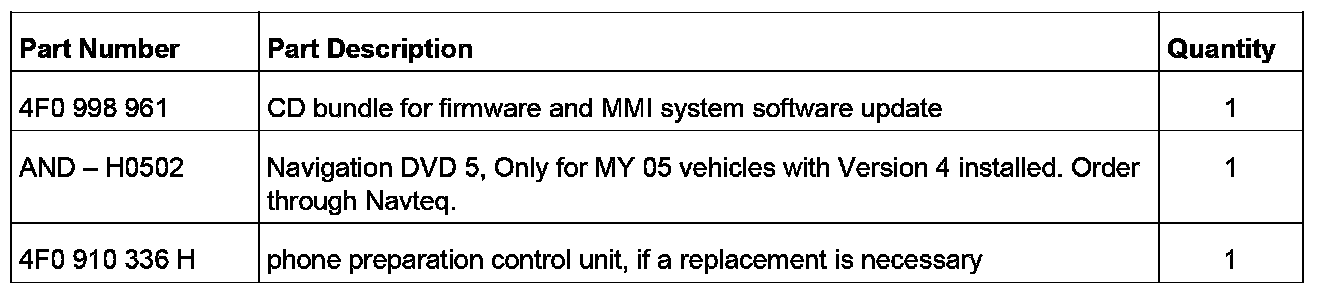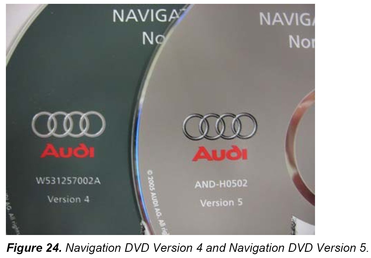 1. If the vehicle is MY 2005, it may still have a Version 4 Navigation DVD installed. Replace Version 4 Navigation DVDs with a Version 5 Navigation DVD prior to the MMI component Update. The DVD can be obtained through the Navteq hotline and claimed as a sublet part.