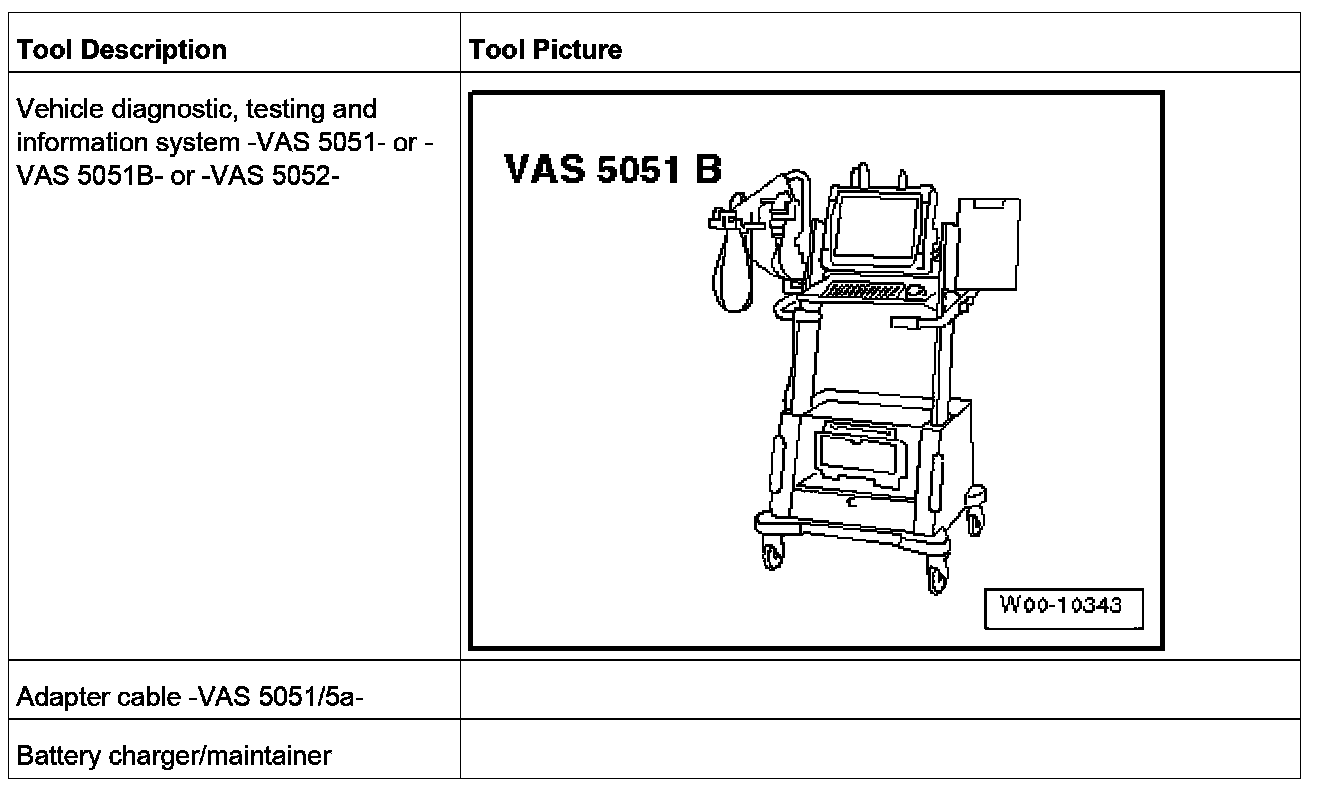 1. Connect vehicle diagnostic, testing and information system VAS 5051- or - VAS 5051B- or VAS 5052- (with online capability) to the vehicle.