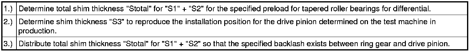 • Careful adjustment of the drive pinion and ring gear is important for the service life and smooth running of the final drive. For this reason, the drive pinion and ring gear are matched together during manufacture, and checked to ensure a good mesh pattern and quiet running in both directions of rotation. The position of quietest running is found by moving the drive pinion in an axial direction and at the same time lifting the ring gear out of the zero-play mesh position by the amount necessary to maintain the backlash within the specified tolerance.