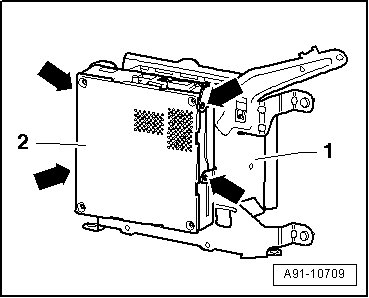 - Remove bolts - arrows - (3 Nm) on TV Tuner - 2 - and remove it from bracket - 1 -.