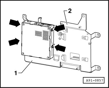 - Remove the screws - arrows - (3 Nm) on the back of the retaining plate - 2 - for the TV tuner - 1 -.